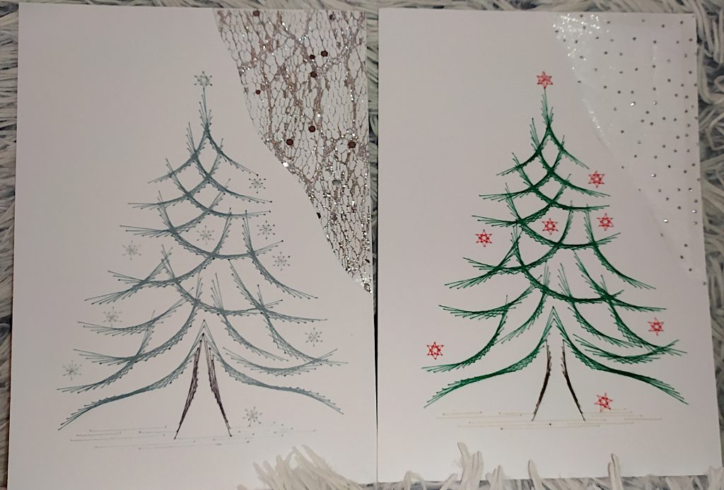 Za motyw przewodni wybrałam choinkę. Starałam się spersonalizować każdą kartkę. Użyłam przede wszystkim różnych kolorów, które mają odzwierciedlać obdarowywanego i jego dom. Eksperymentowałam również ze sposobem wyszywania gwiazdek. Znalazłam trzy, ale najbardziej podobały mi się te, które wykorzystałam na kartce znajdującej się po lewej stronie.