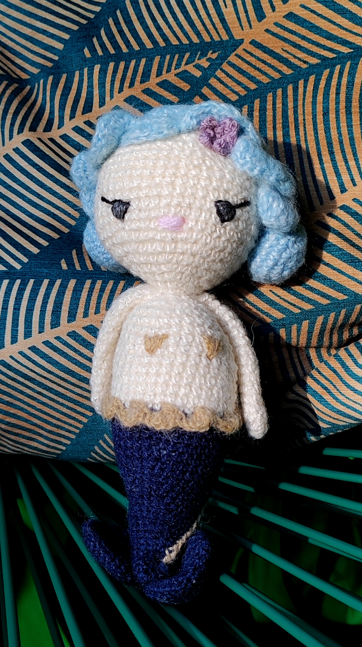 Po raz pierwszy brałam udział w takim wyzwaniu, więc nie chciałam zmieniać wzoru. Natomiast zawsze, czytając nowy wzór sprawdzam, czy mogę ominąć jakiekolwiek szycie. Zdecydowanie jestem zwolenniczką wrabiania wszystkich części. W tym przypadku padło na zrobienie jednoczęściowej płetwy w ogonie oraz wrobienie rąk w tułów. Dodatkowo, jeżeli mogę coś poradzić, to proponuję zszyć razem „włosy” i „grzywkę” przed nałożeniem ich na syrenkę. Da to na pewno większy efekt, niż oddzielne ich przyszywanie i rozmieszczanie na głowie.